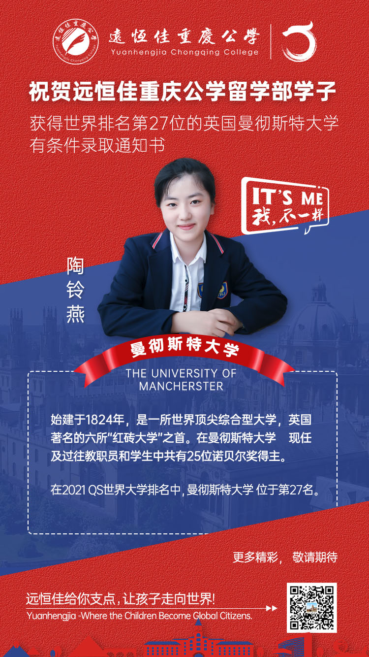 2020年12月18日遠恒佳重慶公學留學部陶鈴燕同學獲世界排名第27的英國曼徹斯特大學預錄通知書!她所報考的城市規(guī)劃專業(yè),在英國排名第二!