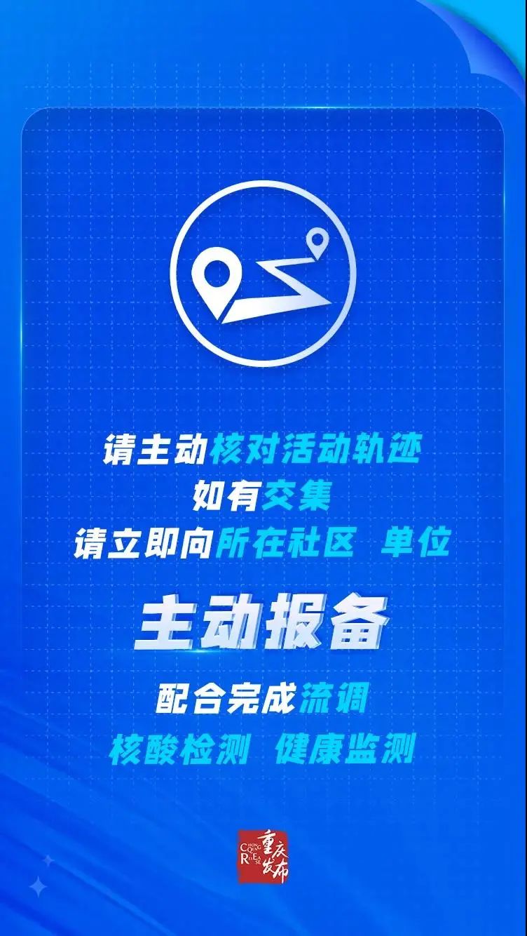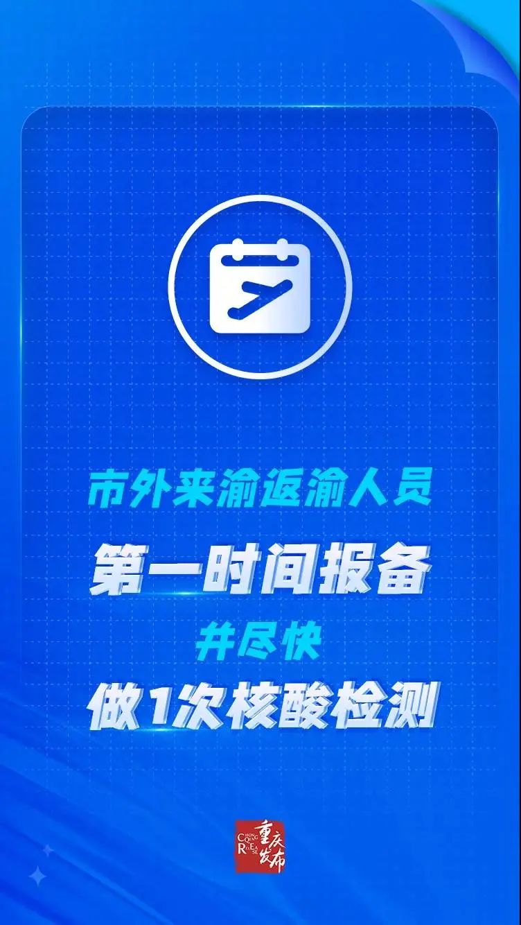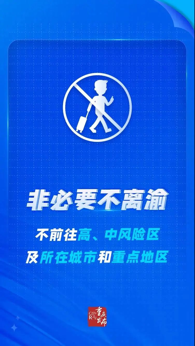 關(guān)注疫情動(dòng)態(tài),及時(shí)了解中高風(fēng)險(xiǎn)地區(qū)信息。如非必要,不要前往中高風(fēng)險(xiǎn)地區(qū);如非必要,不要出境。中高風(fēng)險(xiǎn)地區(qū)及境外返渝人員,應(yīng)及時(shí)主動(dòng)向單位、所在地社區(qū)(村)報(bào)告,并配合落實(shí)相關(guān)防控措施。