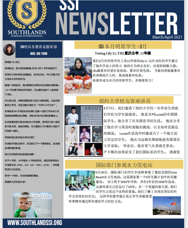 2021年4月21日六我校留學(xué)部中方校長(zhǎng)獲悉:美國(guó)索斯蘭新聞轉(zhuǎn)載了重慶市遠(yuǎn)恒佳學(xué)校留學(xué)部的新聞并將其翻譯成中文同時(shí)發(fā)布。與此同時(shí),重慶市遠(yuǎn)恒佳學(xué)校留學(xué)部李玉婷同學(xué)被評(píng)為美國(guó)索斯蘭月明星學(xué)生。在此表示祝賀!