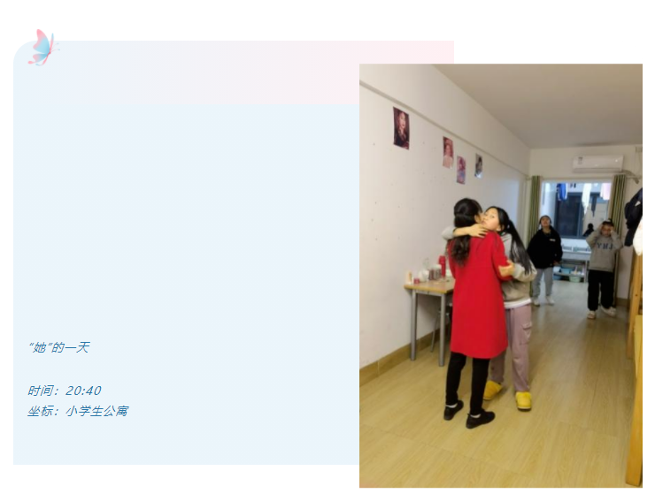 21:30班主任例行查寢,看那對思念媽媽在外工作而長久不能相見的娃實在落寞,她決定今晚把倆娃帶回宿舍,好好心疼下。把寶貝樂得呀,相信今晚在老師的懷里,一定能睡得很香吧。