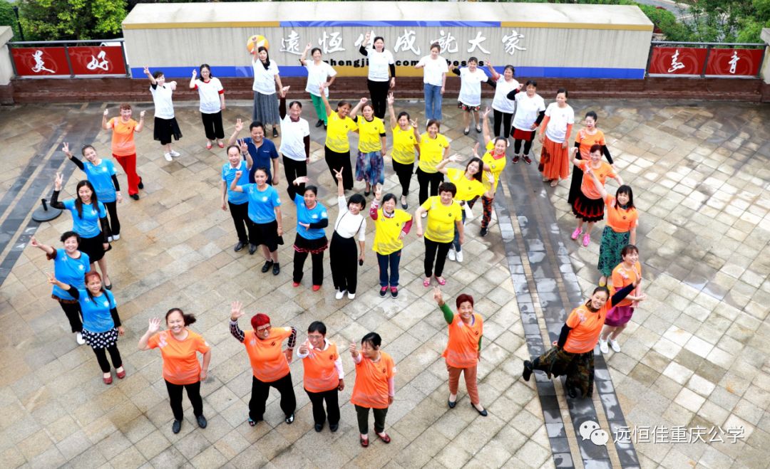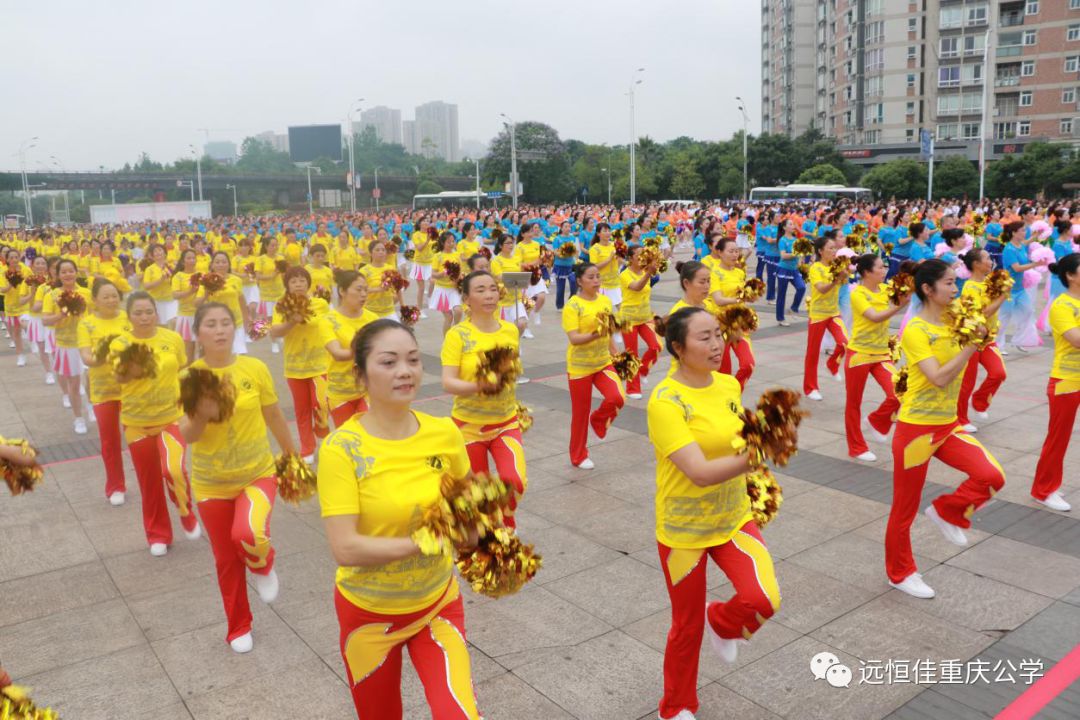 19個(gè)街鎮(zhèn)1000人的比賽隊(duì)伍,身穿遠(yuǎn)恒佳重慶公學(xué)的文化衫,在體育廣場(chǎng)歡歌暢舞。