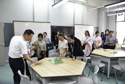 參訪團(tuán)一行,首先參觀了我校各處代表建筑,不高山、湖畔書院、高爾夫球場(chǎng)、行健館、科技樓。在參觀途中,冉澤明副校長(zhǎng)向參訪團(tuán)園長(zhǎng)介紹了我校自開學(xué)以來(lái)的各項(xiàng)校園建設(shè)、教學(xué)現(xiàn)狀以及在教育教學(xué)中所取得的各項(xiàng)成績(jī)。