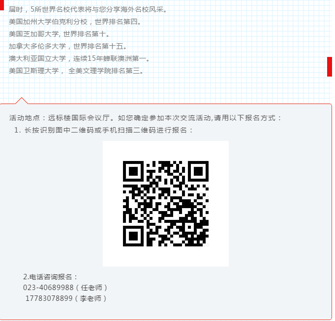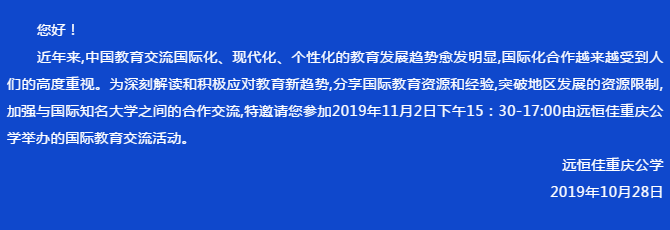 近年來,中國教育交流國際化、現(xiàn)代化、個(gè)性化的教育發(fā)展趨勢愈發(fā)明顯,國際化合作越來越受到人們的高度重視。為深刻解讀和積極應(yīng)對教育新趨勢,分享國際教育資源和經(jīng)驗(yàn),突破地區(qū)發(fā)展的資源限制,加強(qiáng)與國際知名大學(xué)之間的合作交流,特邀請您參加2019年11月2日下午15:30-17:00由遠(yuǎn)恒佳重慶公學(xué)舉辦的國際教育交流活動。